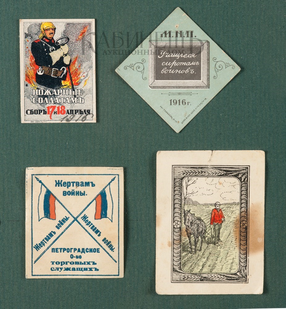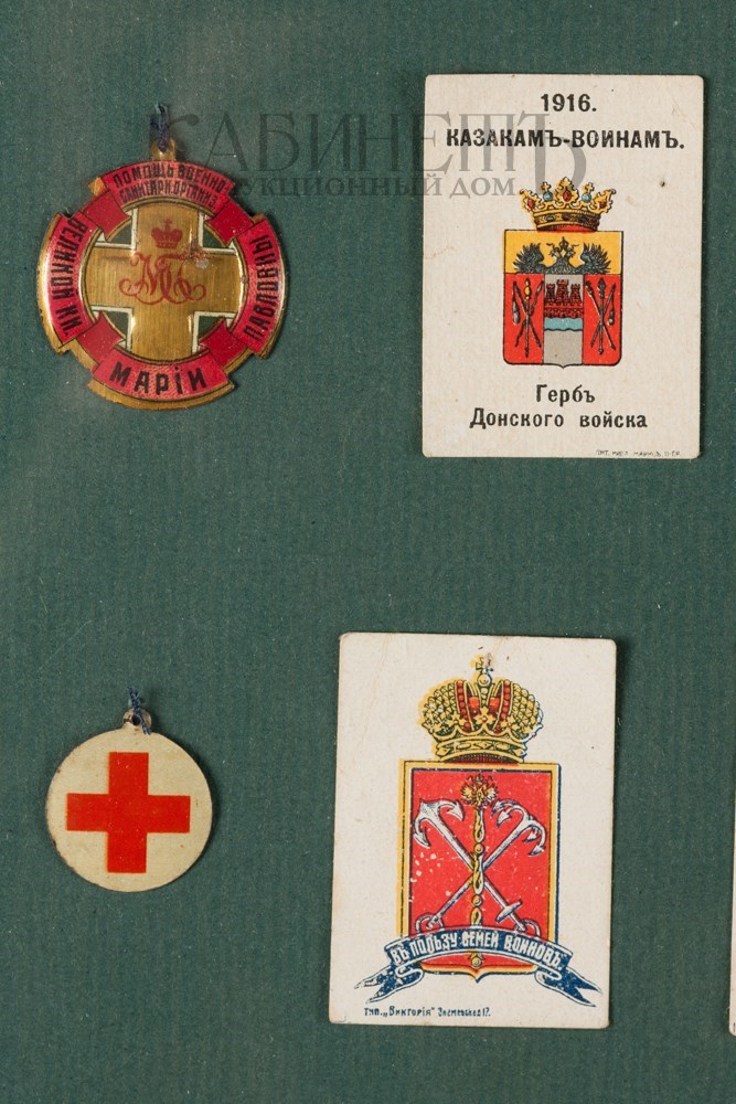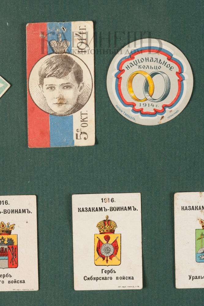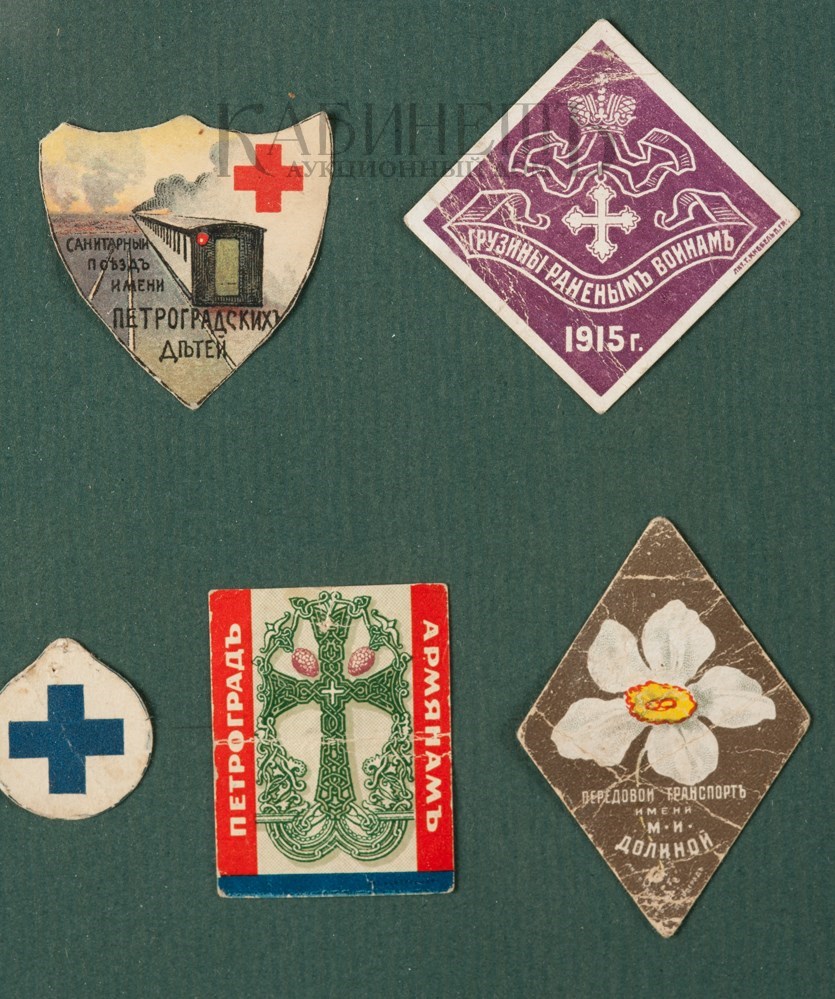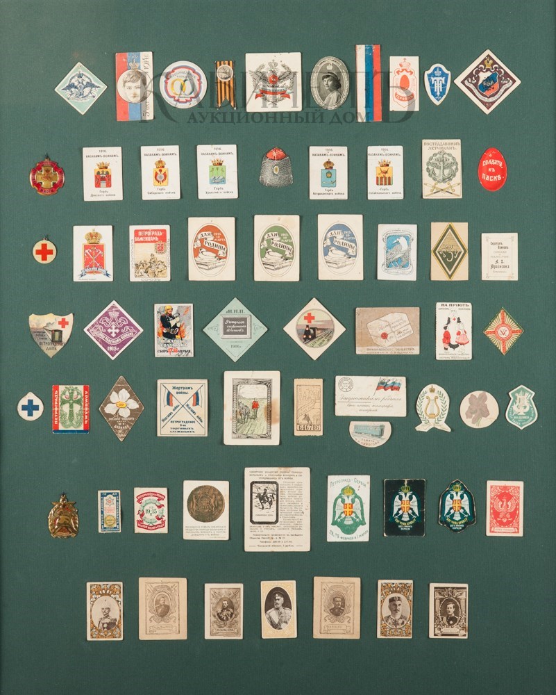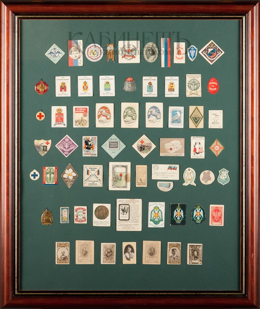 Коллекция латунных жетонов и бумажных марок благотворительных (кружечных) сборов периода Первой мировой войны.