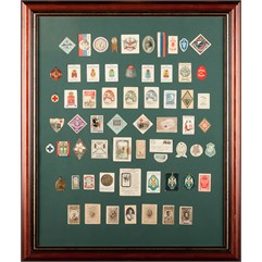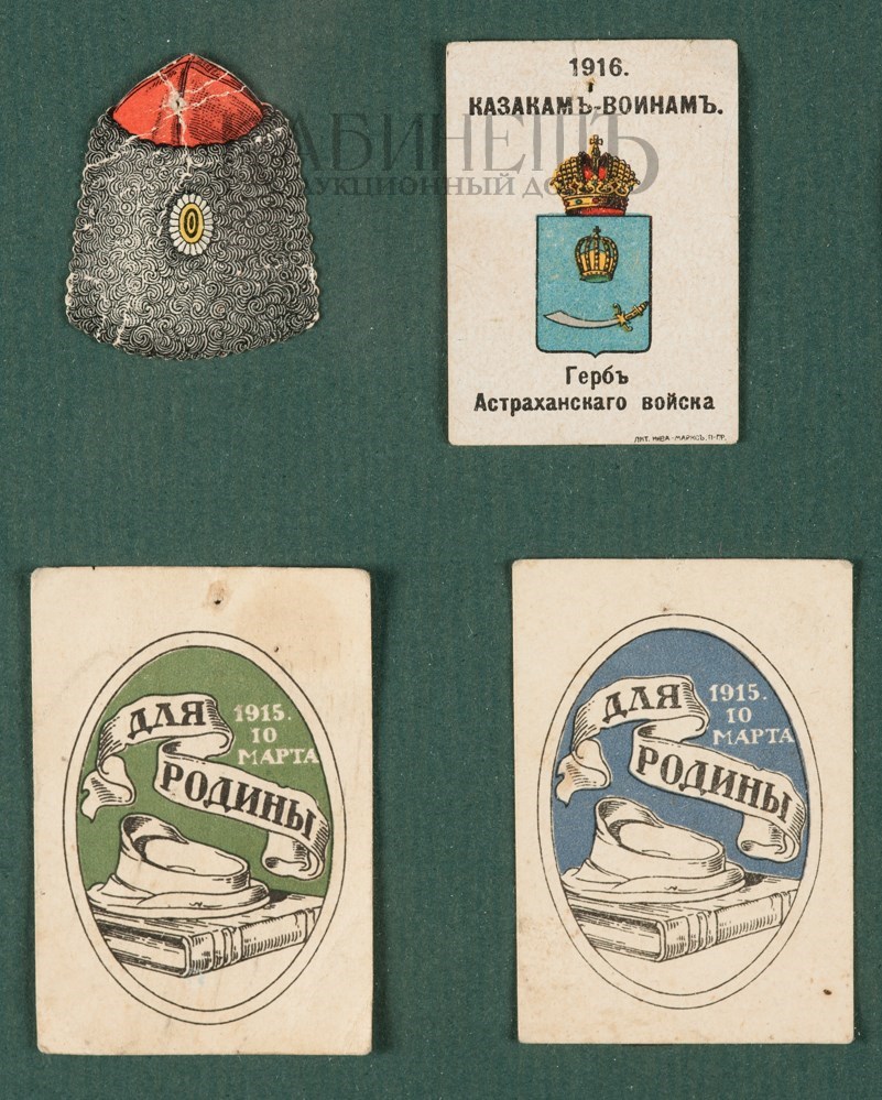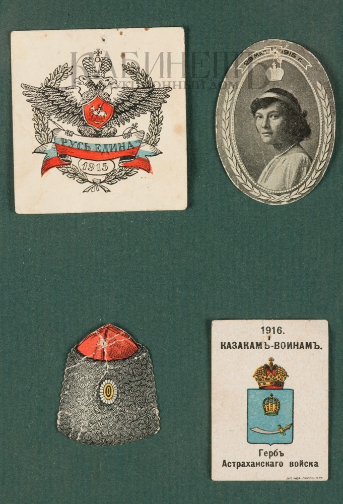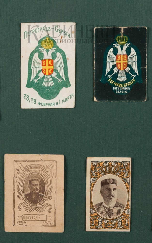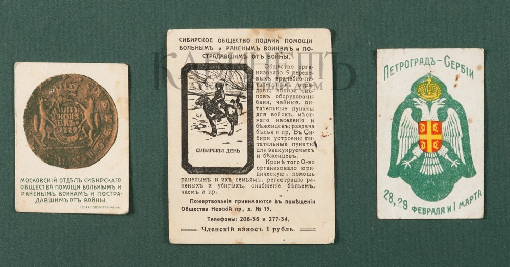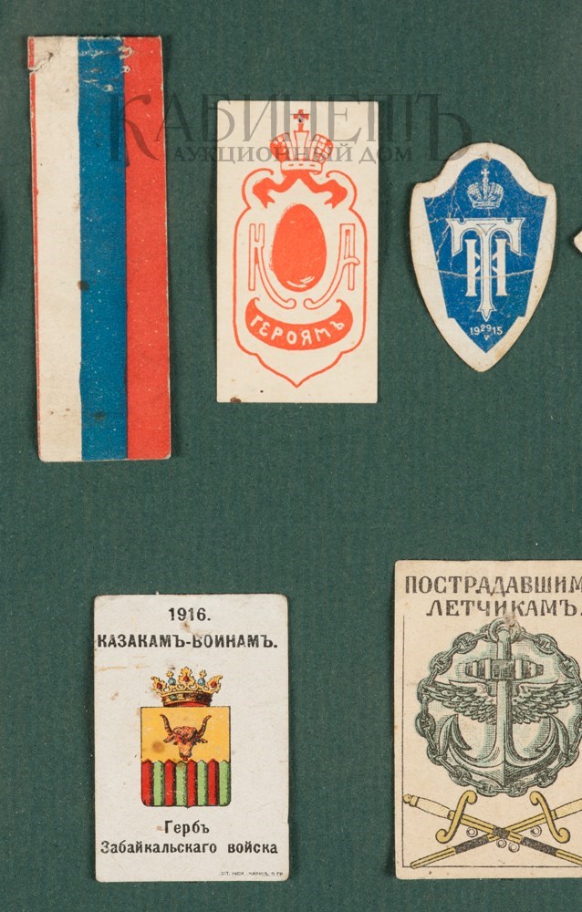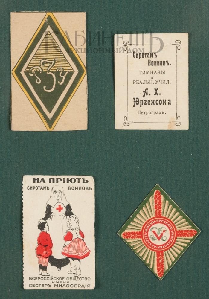 Коллекция латунных жетонов и бумажных марок благотворительных (кружечных) сборов периода Первой мировой войны.