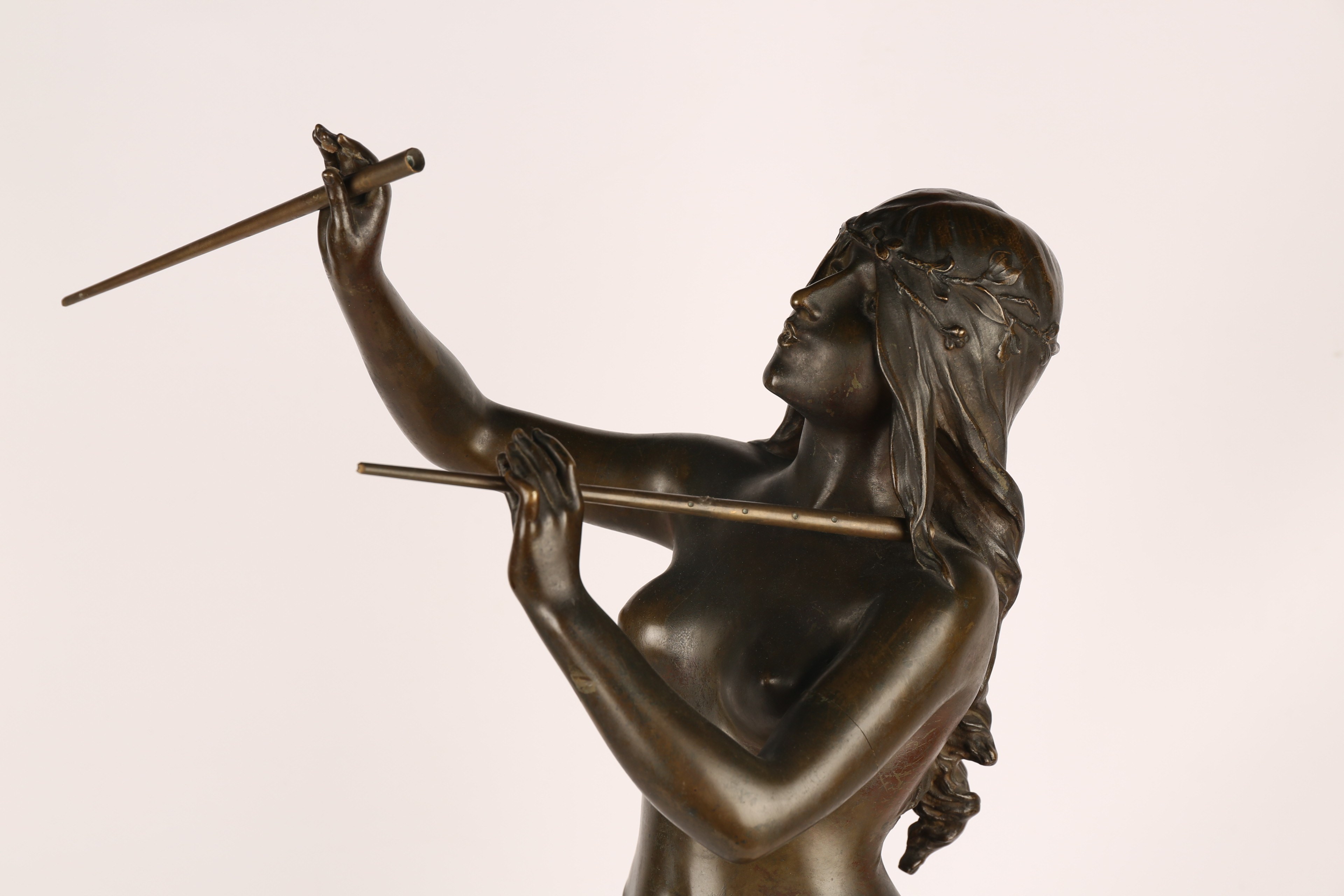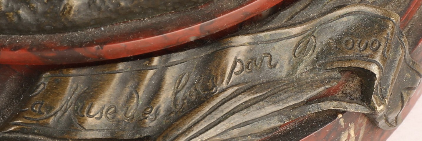 Бронза, литье, монтировка, патинирование; мрамор гриотт, точение, полировка. На поземе бронзовая накладка с гравировкой: «Muse de bois par Drouo»