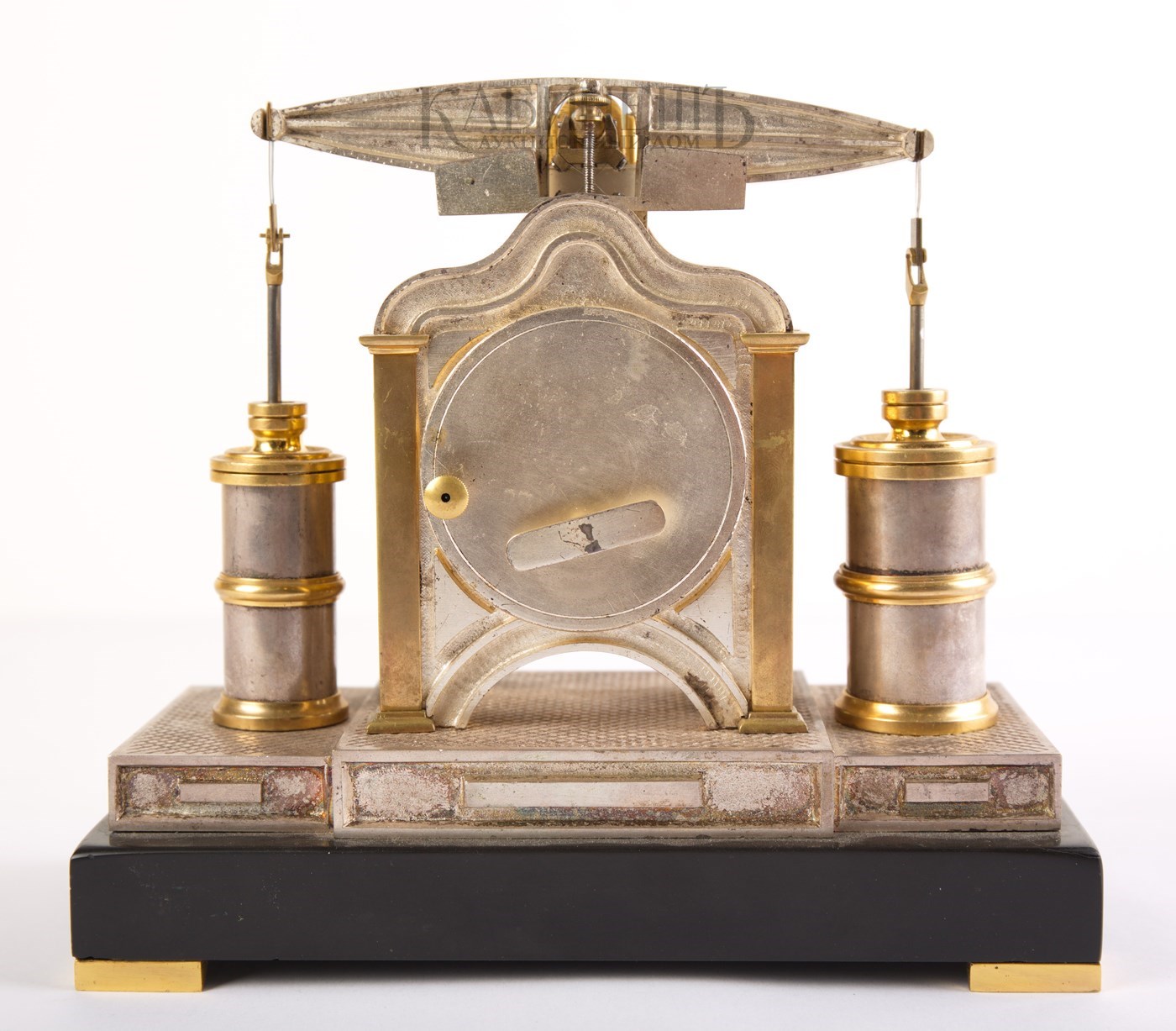 Часовой механизм с пружинным двигателем, двумя заводными барабанами хода и боя. Запас хода – 8 дней. Анкерный спуск. Маятник в виде коромысла.